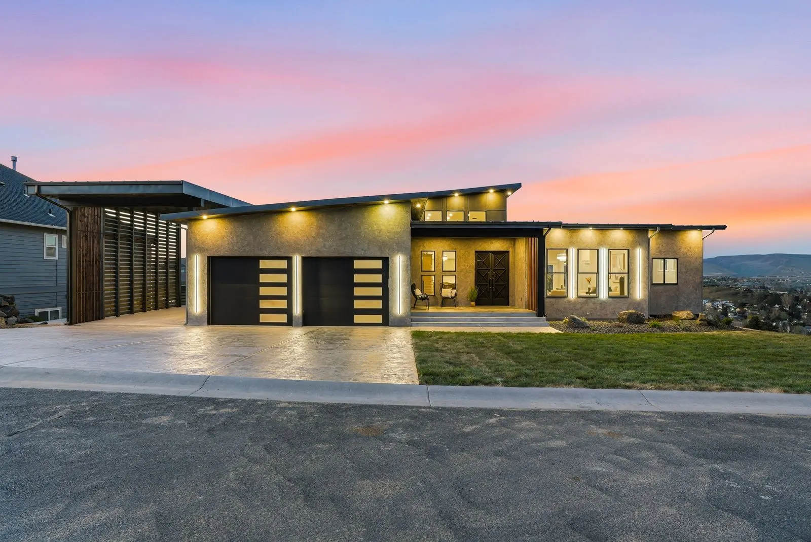 You’re walking up the steps when it stops you. Anchored before you — custom black iron double doors in a bold geometric pattern. Floor-to-ceiling cedar warming the raw concrete facade. A tongue-and-groove soffit drawing you in. And through the glass, a chandelier catching the light inside, hinting at everything still to come.